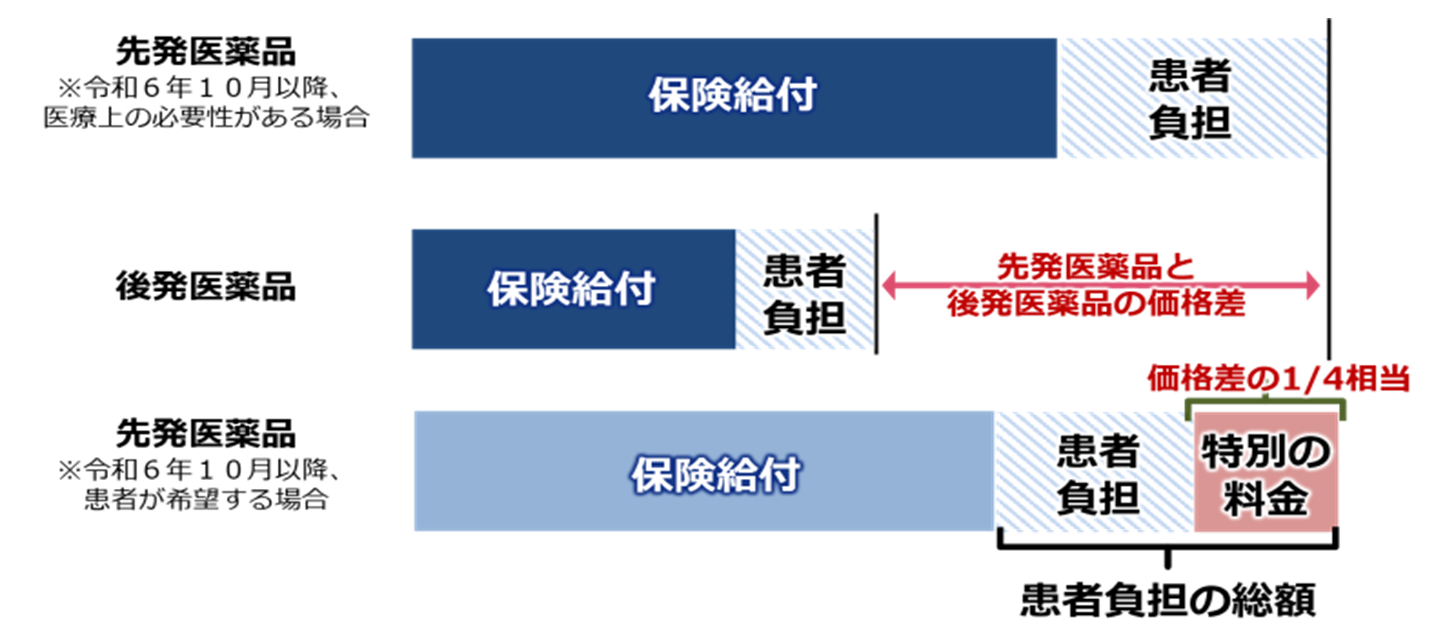 令和6年10月からの医薬品の自己負担の新たな仕組みとして、後発医薬品(ジェネリック医薬品)があるお薬で、先発医薬品の処方を希望される場合は、特別の料金をお支払いいただきます。